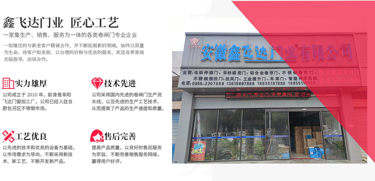 - 安徽鑫飛達(dá)門(mén)業(yè)有限公司成立于1998年,前身是阜陽(yáng)飛達(dá)門(mén)窗加工廠,現(xiàn)在公司已經(jīng)入駐合肥包河區(qū)不銹鋼市場(chǎng)。本公司是一家集生產(chǎn)、銷(xiāo)售、服務(wù)為一體的各類(lèi)卷閘門(mén)專(zhuān)業(yè)企業(yè)。公司采用國(guó)內(nèi)先進(jìn)的卷閘門(mén)生產(chǎn)流水線,以及先進(jìn)的生產(chǎn)工藝技術(shù)、從而提高了產(chǎn)品的生產(chǎn)速度和質(zhì)量。旗下?lián)碛酗w達(dá)九州和飛達(dá)門(mén)業(yè)兩個(gè)注冊(cè)商標(biāo)。 產(chǎn)品種類(lèi)齊全 ,質(zhì)量可靠,主要有不銹鋼推拉門(mén),防火卷簾門(mén),電動(dòng)卷...